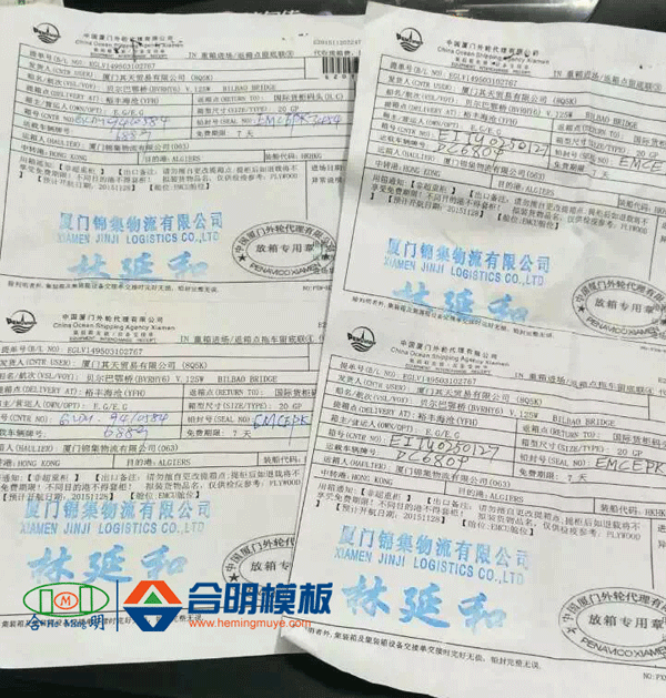 近期,合明模板出貨11柜酚醛建筑模板至阿爾及利亞,共計10500張。