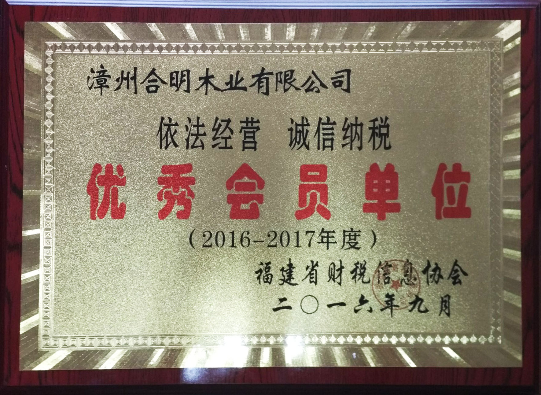 好消息!9月27日,合明模板再次斬獲2016-2017年度福建省“誠信經營、依法納稅”優秀會員單位!合明模板連續多年獲得該榮譽,是福建省木業行業誠信經營、依法納稅榜樣單位。