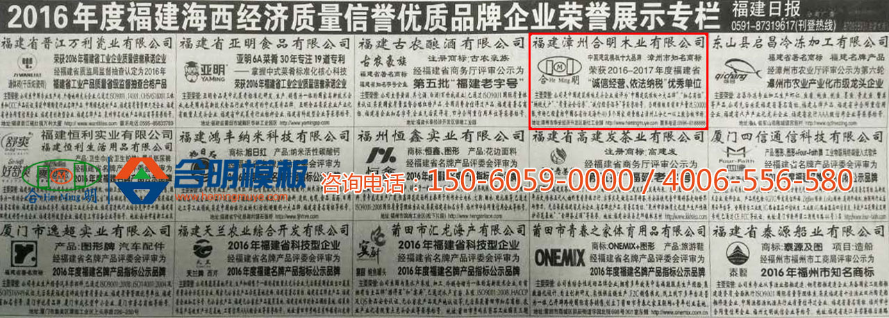 近日,由福建日報主辦的《2016年度福建海西經濟質量信譽優質品牌企業》評選結果公示,“合明牌建筑模板”憑借多項品牌榮譽當選2016年度優質品牌!