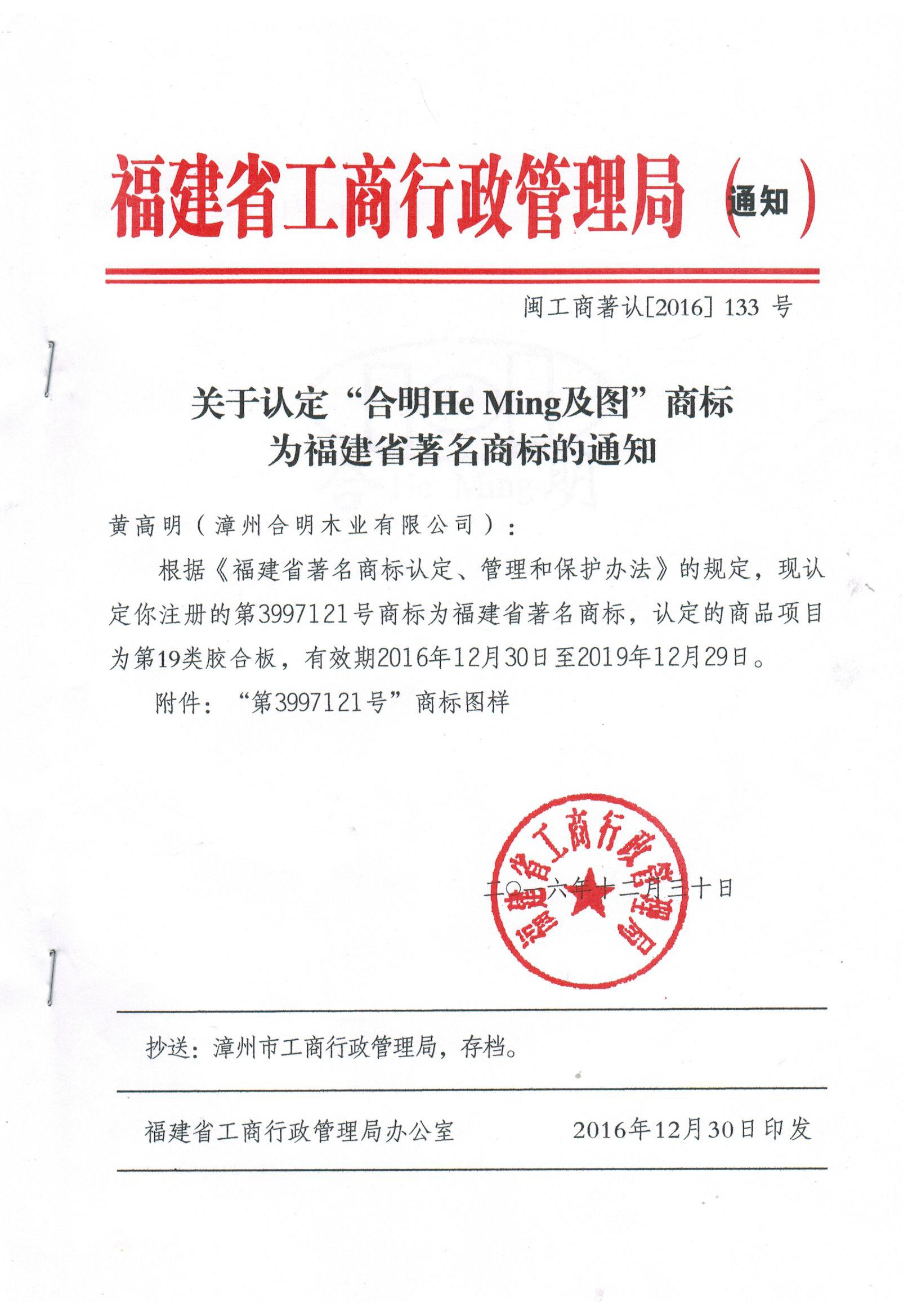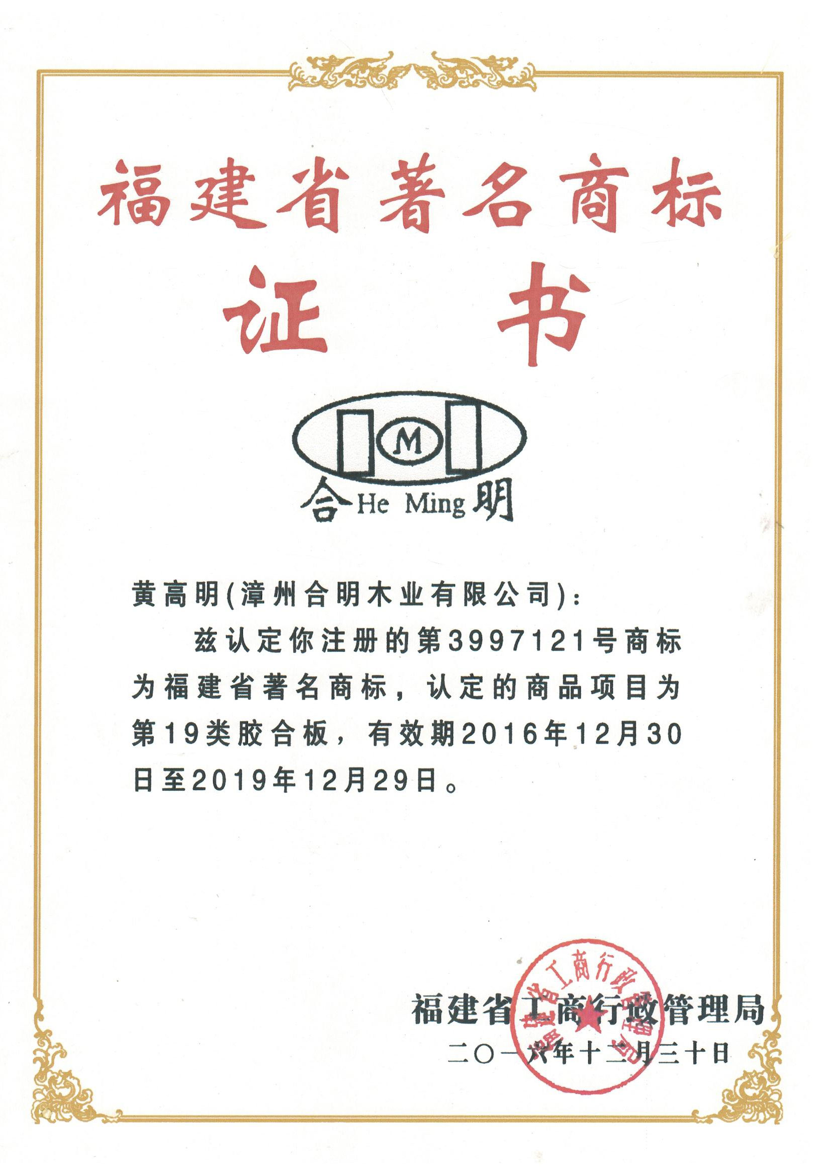 2016年12月,根據福建省工商行政管理局通知,福建合明木業有限公司的“合明+圖”,經福建省工商局局長辦公會議研究,被正式認定為福建省著名商標,是福建省膠合板行業年度唯一一家獲得該項榮譽的企業。