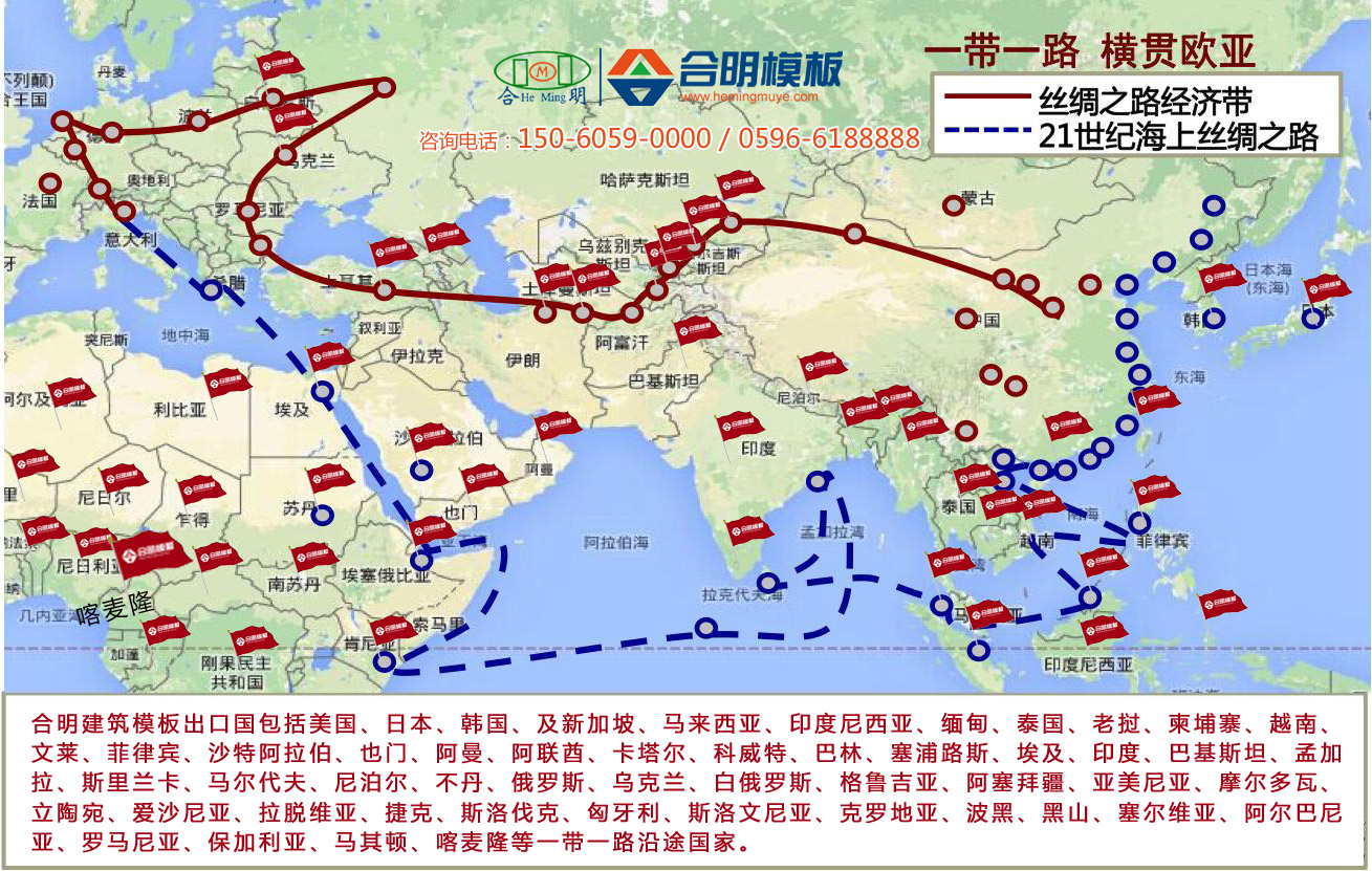 借勢“一帶一路”政策,合明建筑模板近年來不斷拓展海外出口市場。目前已成功出口海外40多個國家,是一帶一路建筑模板出口品牌重要供應商。