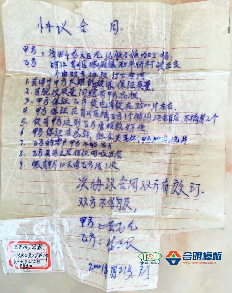 在裝潢店同合明模板合作期間,由于工作關(guān)系,凌正良經(jīng)常接觸到黃志藝,黃志藝同凌正良講模板市場(chǎng),熱心實(shí)誠(chéng)的凌正良不惜賜教,給這個(gè)初到蕭山的小伙子黃志藝傳授銷售經(jīng)驗(yàn),并利用自己多年從業(yè)的人際關(guān)系在各個(gè)方面幫助黃志藝。經(jīng)過幾個(gè)月愉快的合作及雙方的了解,2001年7月,凌正良決定出來(lái)自己開店賣建筑模板,并同黃志藝簡(jiǎn)單地用作業(yè)紙手寫簽訂了第一個(gè)協(xié)議合同,成為蕭山合明模板獨(dú)家代理,開始了代理合明模板的道路。當(dāng)時(shí)的凌正良正好49歲。