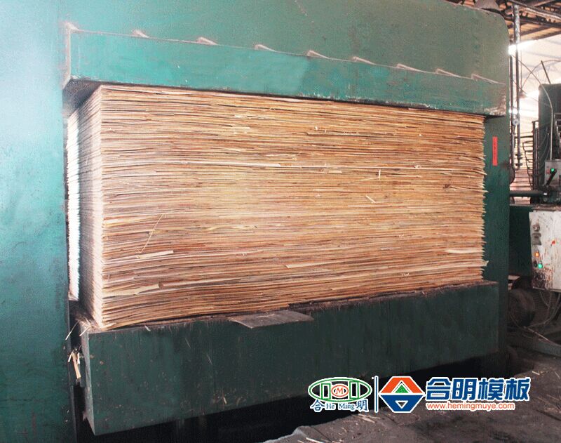 5、鋪好覆膜的模板層進行熱壓,各層板再次緊緊結合,保證模板高壓鍋水煮5小時不開膠,也使模板表面更加平整。