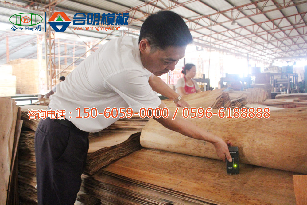 建筑模板的周轉次數和膠水關系密切,但是你可能不知道,原材料的濕度過高,會間接稀釋膠水,使得建筑模板在壓制成型過程中膠合效果差,直接影響周轉次數。合明建筑模板在原材料的把控上十分嚴格,從芯板曬板到進車間排板,要經過多次干濕度抽查,確保干濕度嚴格控制在18度以下。