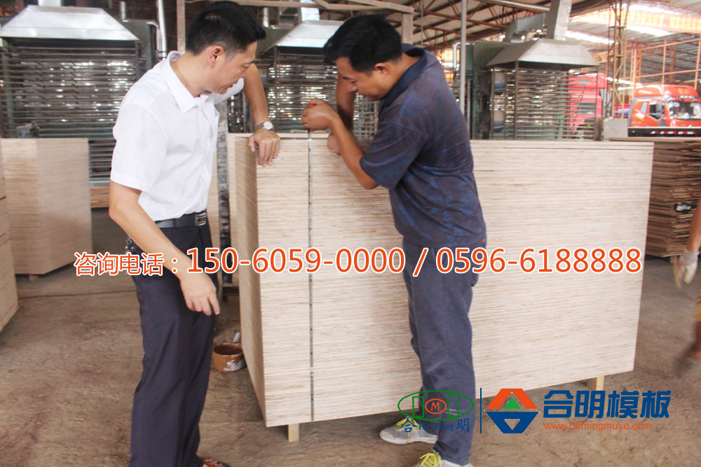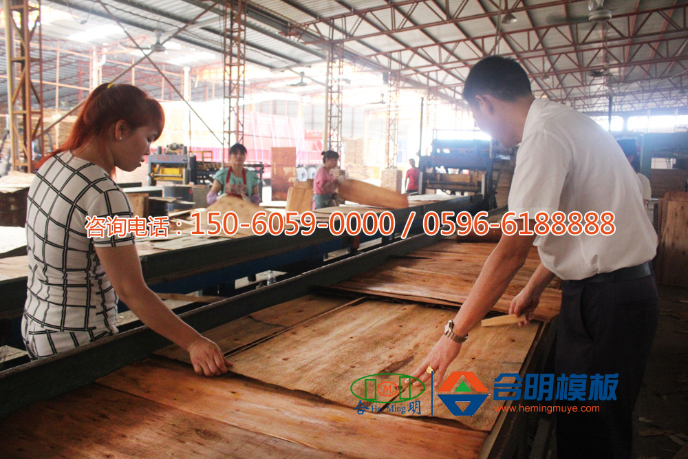 合明模板的排板工藝采用紅外線流水線和人工排板相結合,上下層進口一級面板+芯板縱錯排列排板而成。合明模板排板強調”密實度、平整度、膠合度、堅硬度、光滑度“五度管控法,林廠長每天必到各條流水線,抽檢抽查,如合明建筑模板售后出現問題,責任追究到當天排板個人。