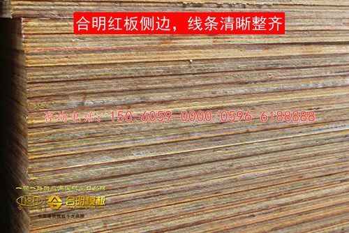 合明紅板由一級桉木芯板和一級松木面板壓制而成,其表面滾有合明自主研制的紅色防水膠,每張紅板面板滾1千克膠水,面膠層厚實,防水效果好。合明紅板經18道扎實的制作工藝及細節處理,表面平整,結實耐磨,周轉次數8次以上,相比市場上同等價格的模板更加耐用,廣受建筑工地好評。