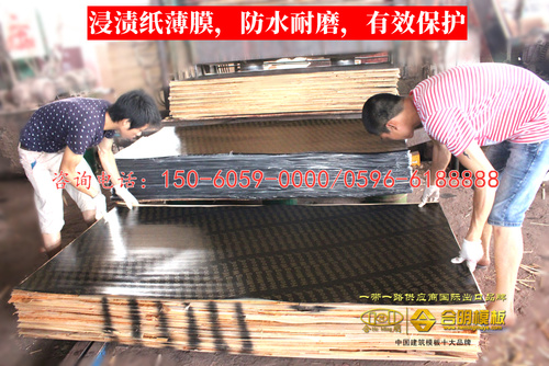 合明覆膜板表面覆有浸漬紙薄膜,這層浸漬紙薄膜經(jīng)超高溫超長時間壓制,膠水及薄膜滲透均勻,使建筑模板表面更平整光滑,更加耐磨防水,大大延長了模板的使用壽命。