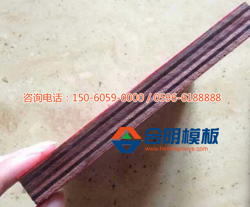 與其他種類模板不同的是,合明苯酚板除了芯板滾足酚醛膠,上下面板也各滾一層足量的酚醛膠,這層酚醛膠是合明膠水廠特制膠水,比其他三聚氰胺膠和脲膠膠性更強,防水防腐,在混泥土和模板中間起到隔閡作用,防止泥沙雨水侵入保護模板,使模板更耐用。